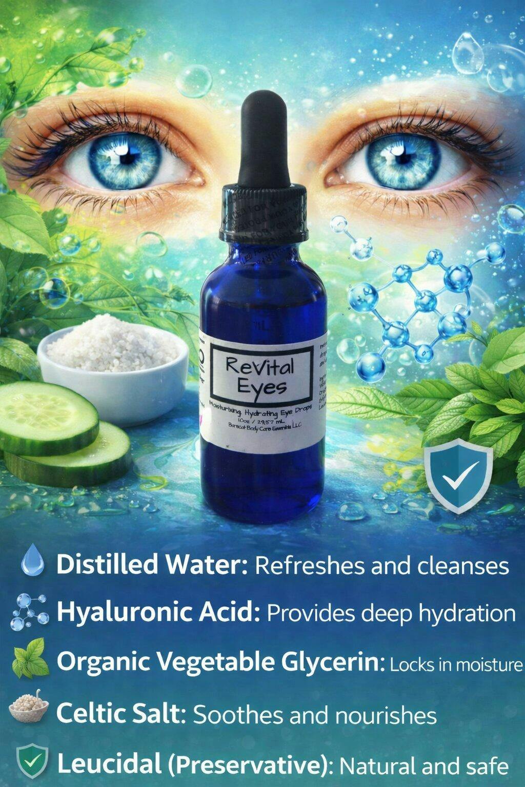ReVital-Eyes is an all-natural, hydrating, and moisturizing eye drop formulated to support and prepare your eyes for use with Barecat Body Care's DMSO and Castor Oil blends.